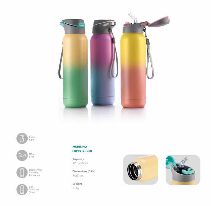 17 盎司定制徽标双酚 A 无铅便携保温水壶(带盖和吸管) 旅行用绳保温水壶